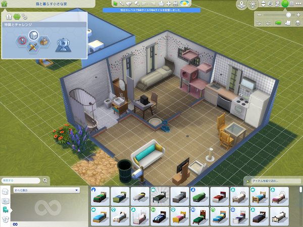 家の中はこんな感じです。レベル2の64タイルのタイニーハウスですが猫用のスペースを置くのには苦労しませんでした。後はプライベートハウスの特質もつけました。これで人間シムはこの家に来ませんね。